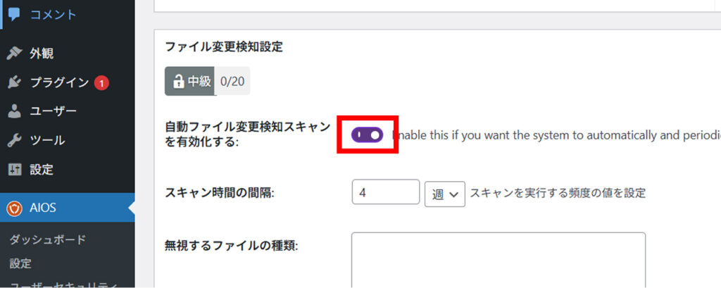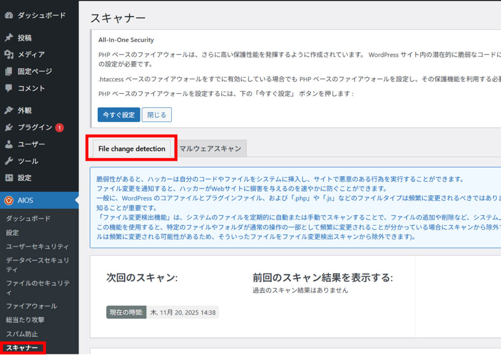 1.WordPress管理画面のサイドメニューから 「AIOS」→「スキャナー」 を開き、続いて 「File change detection」 タブをクリックしてください。