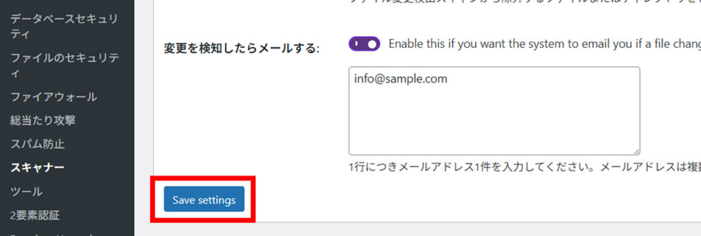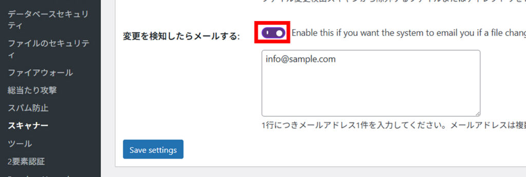 6.「変更を検知したらメールする」をONに変更し、スキャン結果を通知するメールアドレスを入力します。