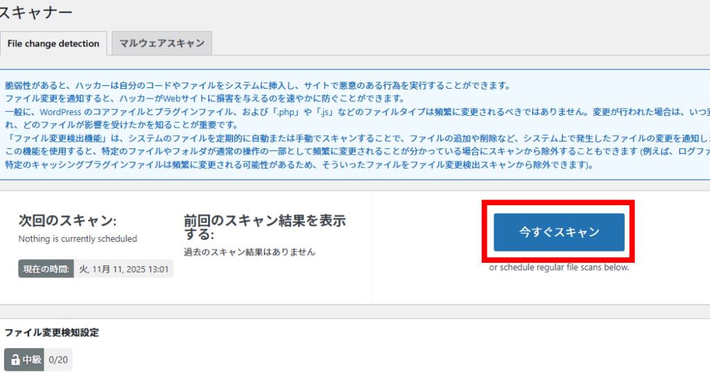 8.最後に、管理画面上部に表示されている 「今すぐスキャン」 ボタンをクリックし、初回のスキャンを実行しましょう。