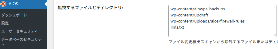 バックアップファイルを保存しているフォルダや、定期的に更新が発生するプラグイン関連のファイルなどは、誤検知を防ぐためにも、除外対象として設定しておくと安心です。