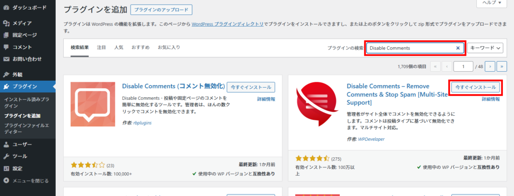 2. プラグインの検索欄に「Disable Comments」と入力します。検索結果に表示される 「Disable Comments – Remove Comments & Stop Spam」プラグインの「今すぐインストール」をクリックしてください。