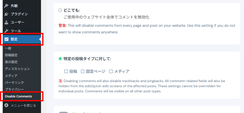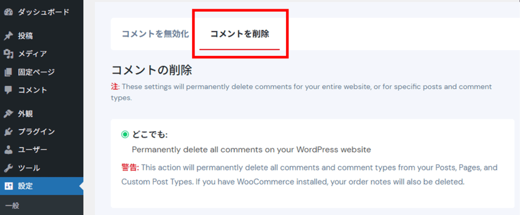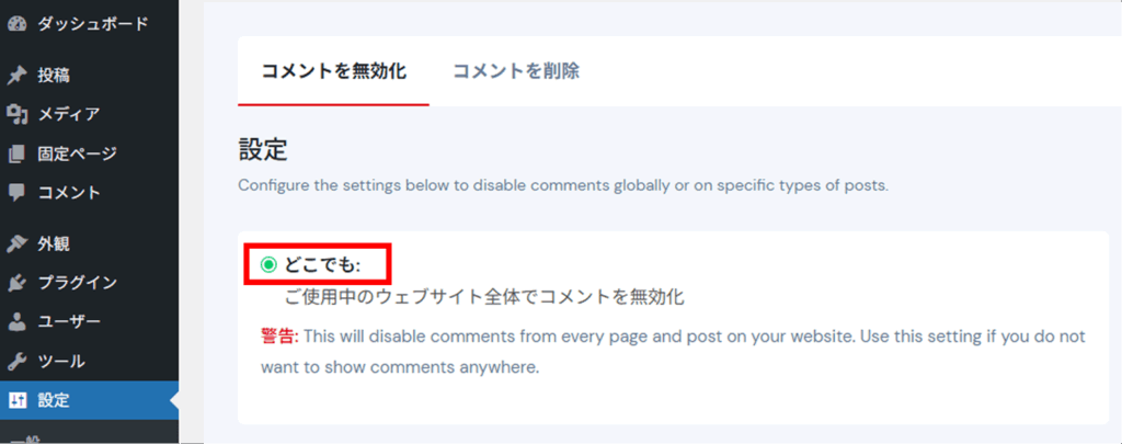 プラグインを有効化したら、さっそくサイト全体のコメント機能を停止してみましょう。