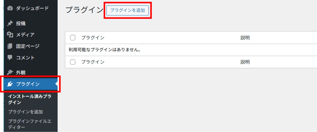 1. WordPressのサイドバーの「プラグイン」を選択後、「プラグインを追加」をクリックします。